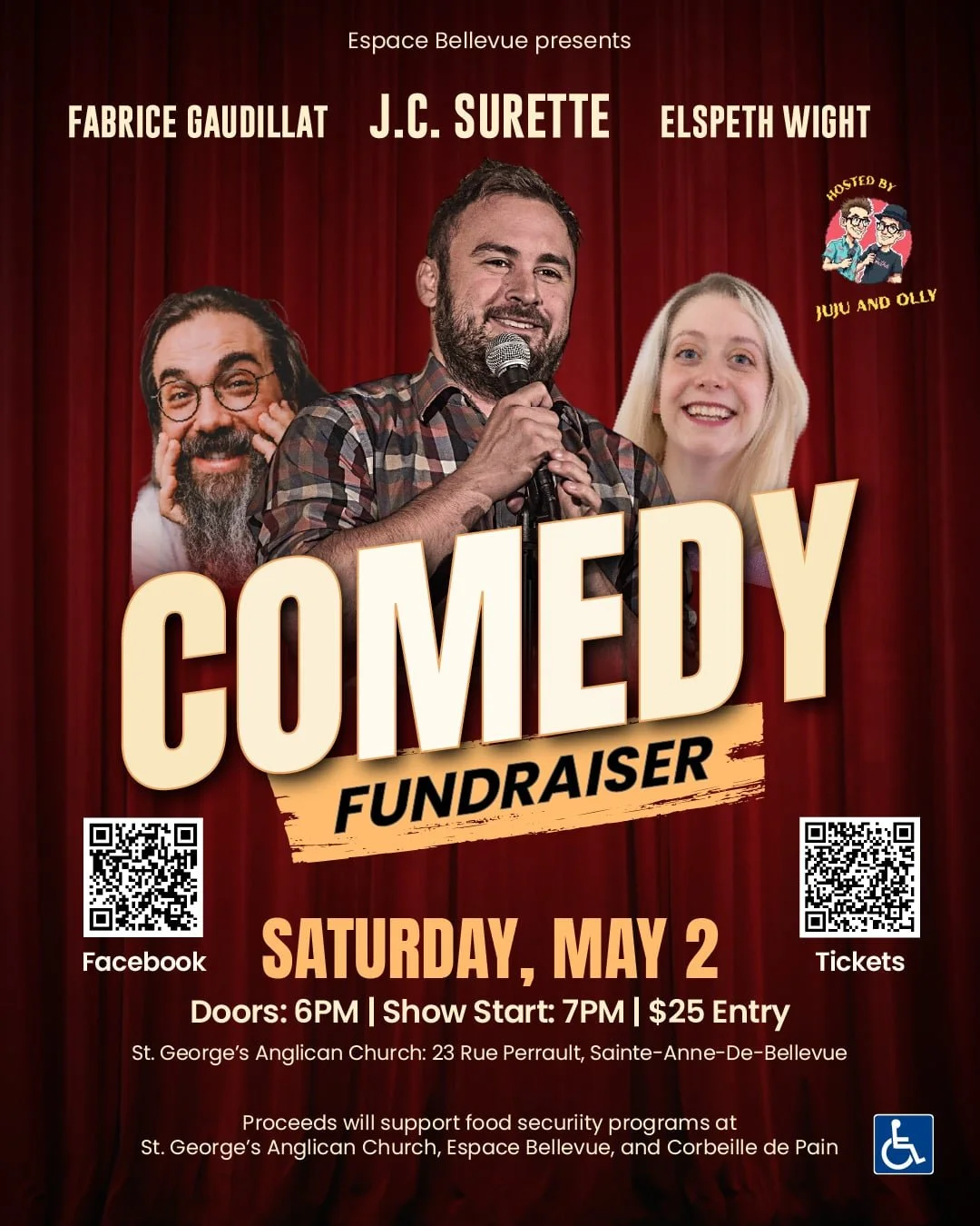Get ready for an evening of laughter for a great cause! Espace Bellevue, our new garden coordinators, will be hosting a Comedy Night in the church hall, with all proceeds supporting three organizations working to address food insecurity in the West Island.